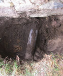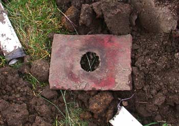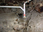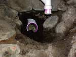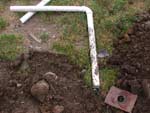 The drain pipe for the septic system exits the foundation and had a pipe that was supposed to allow the release of trapped air. But we discovered when we were digging out the dirt around the pipe that the 'air release pipe' wasn't attached to the main pipe, but was just placed on top of this hole. |