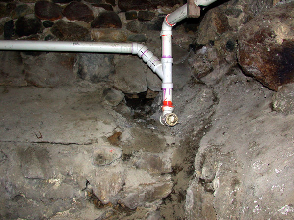 The old drain pipe from the inside of the foundation. This was 2" pvc piping and we replaced this with a 4" pipe. To do so, Tony had to drill a larger hole in the concrete. |