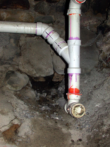The new drain pipe tee is in place and now needs to be joined to the old 'Y' portion. |